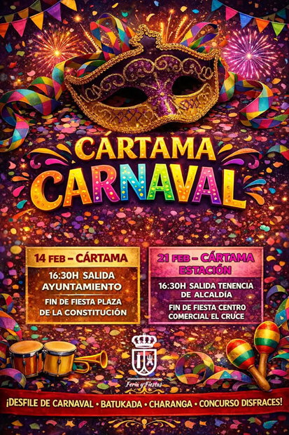 El Ayuntamiento de Cártama nos informa que los días 14 y 21 de febrero tendrán lugar los pasacalles de Carnaval de Cártama Pueblo y Cártama Estación, respectivamente. CÁRTAMA PUEBLO, sábado, 14 de febrero: La concentración de participantes se iniciará en la Puerta del Ayuntamiento de Cártama en calle Rey Juan Carlos I de Cártama Pueblo sobre las 16 horas, seguidamente se iniciará el pasacalles hasta calle Bajondillo, girando hasta calle González Marín recorriéndola al completo. Se cruza la MA – [...]