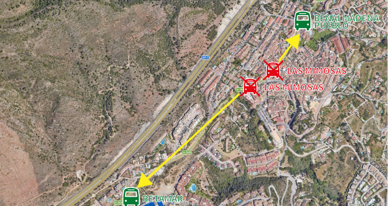 ACTUALIZACIÓN: Por motivos de seguridad vial, no es posible ubicar una parada provisional, por lo que la parada Las Mimosas queda anulada hasta lafinalización de los trabajos. Las paradas en servicio más cercanas Benalmádena Pueblo y Retamar. La parada de Las Mimosas, en ambos sentidos, se trasladará al cruce de la Avenida Retamar con Calle Matogrosso.