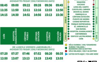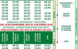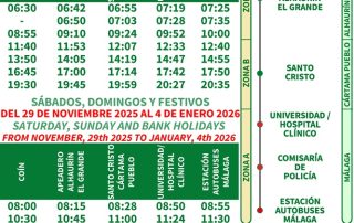 Les informamos que, coincidiendo con el inicio de la campaña y el alumbrado navideño, la ruta M-167 Coín-Alhaurín el Grande-Málaga extenderá su servicio para operar también durante los sábados, domingos y días festivos. Esta ampliación estará vigente desde el 29 de noviembre de 2025 hasta el 4 de enero de 2026, facilitando así los desplazamientos a Málaga para compras, ocio y disfrutar de la iluminación festiva sin necesidad de utilizar el vehículo particular. El servicio reforzado contará con 6 expediciones completas (ida y vuelta) por día, con salidas desde Coín a las 08:00, 10:30, 13:00, 15:25, 17:35 y 20:05 horas, y desde Estación de Málaga a las 09:25, 11:50, 14:05, 16:30, 19:00 y 21:30 horas. Esta medida busca mejorar la [...]