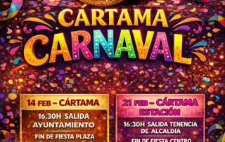 El Ayuntamiento de Cártama nos informa que los días 14 y 21 de febrero tendrán lugar los pasacalles de Carnaval de Cártama Pueblo y Cártama Estación, respectivamente. CÁRTAMA PUEBLO, sábado, 14 de febrero: La concentración de participantes se iniciará en la Puerta del Ayuntamiento de Cártama en calle Rey Juan Carlos I de Cártama Pueblo sobre las 16 horas, seguidamente se iniciará el pasacalles hasta calle Bajondillo, girando hasta calle González Marín recorriéndola al completo. Se cruza la MA – 3304 hacia C/Cabrera, C/ Cabañeros y C/Ordesa, para finalizar el pasacalles en la puerta de la casa consistorial en C/Juan Carlos I tras cruzar la MA – 3304 de nuevo. El fin de fiesta se realizará en Plaza de la [...]