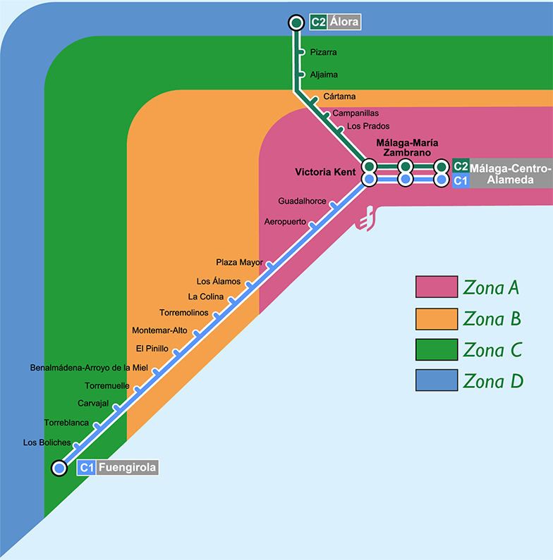 With the Consortium travel card you can use the two Renfe Suburban Trains routes in Malaga (routes C-1 and C-2), with the same bus fares, and transfer to other modes of transport (buses and MetroMálaga), with the same discounts for young people and large families.