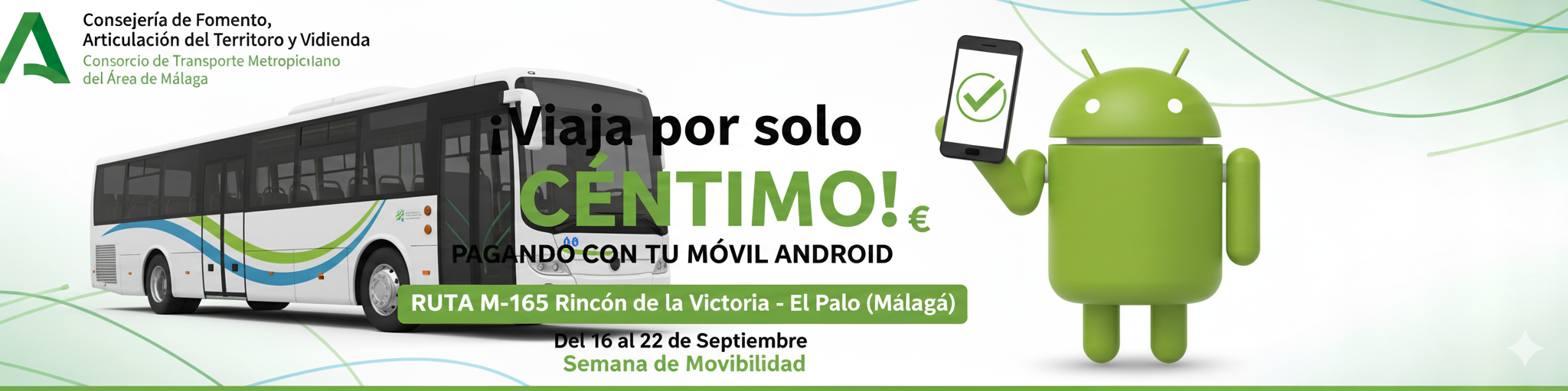 El Consorcio de Transporte Metropolitano del Área de Málaga (CTMAM) ha anunciado una iniciativa especial para incentivar el uso de la nueva línea exprés M-165, que conecta Rincón de la Victoria y El Palo (Málaga). Como parte de las actuaciones de la Semana de la Movilidad, que se desarrollará del 16 al 22 de septiembre, los viajeros que utilicen su teléfono móvil para abonar el billete disfrutarán de un precio simbólico de tan solo un céntimo de euro por trayecto (solo en modelos Android).