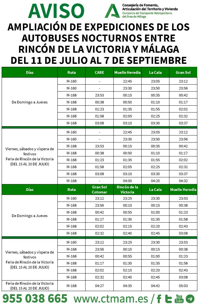 Además, durante la Feria de Rincón de la Victoria, del 15 al 20 de julio, se amplía aún más el servicio, de forma que la ruta M-168C funcionará con 8 salidas desde Málaga y 7 desde Rincón de la Victoria: