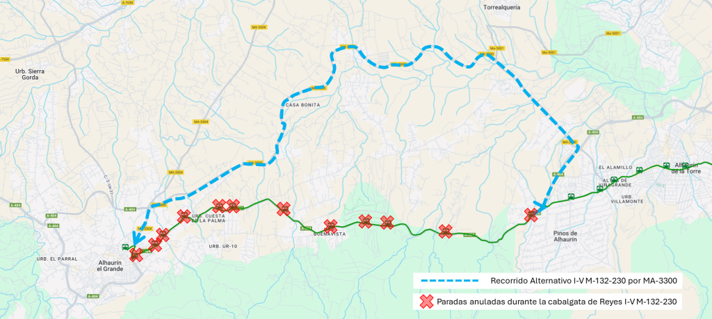- Alhaurín el Grande: ACTUALIZACIÓN: LA CABALGATA SE CELEBRARÁ EL MARTES, 6 DE ENERO. La cabalgata estrena nuevo recorrido, con salida a las 17:00 horas: Avenida Gerald Brenan, Calle Cilla, Plaza Baja, Calle San Sebastián, Calle Nueva, Calle Candilejas, Calle Convento y llegada al Ayuntamiento de Alhaurín el Grande sobre las 19:00 horas. Los autobuses de las rutas M-132 y M-230, tanto en ida como vuelta, tomarán el recorrido alternativo por la carretera MA-3300, saliendo y entrando a Alhaurín El Grande desde el cruce del Mercado Mayoristas directamente hasta el apeadero. En ambos sentidos, las paradas comprendidas entre Cruz de la Misión y Venta Vázquez (ambas incluidas) quedarán anuladas durante la duración de la Cabalgata de Reyes Magos. El recorrido habitual se retomaría en la parada Pinos de Alhaurín II en sentido Málaga y directamente en el Apeadero en sentido Alhaurín El Grande – Coín.