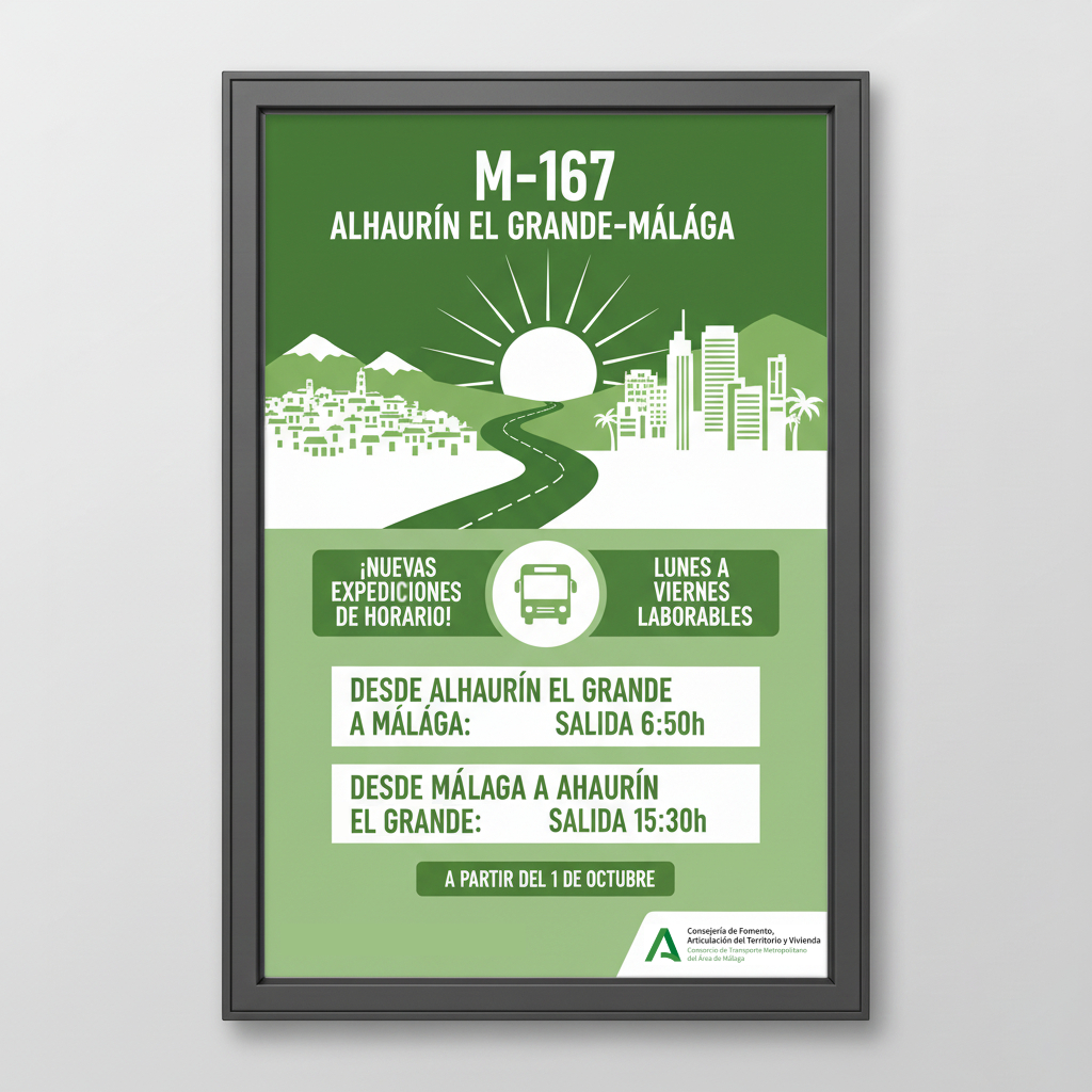 Nueva expedición parcial de la línea M-167 con salida desde Alhaurín el Grande y destino Málaga a las 6:50, y con salida desde Málaga y destino Alhaurín el Grande a las 15:30.