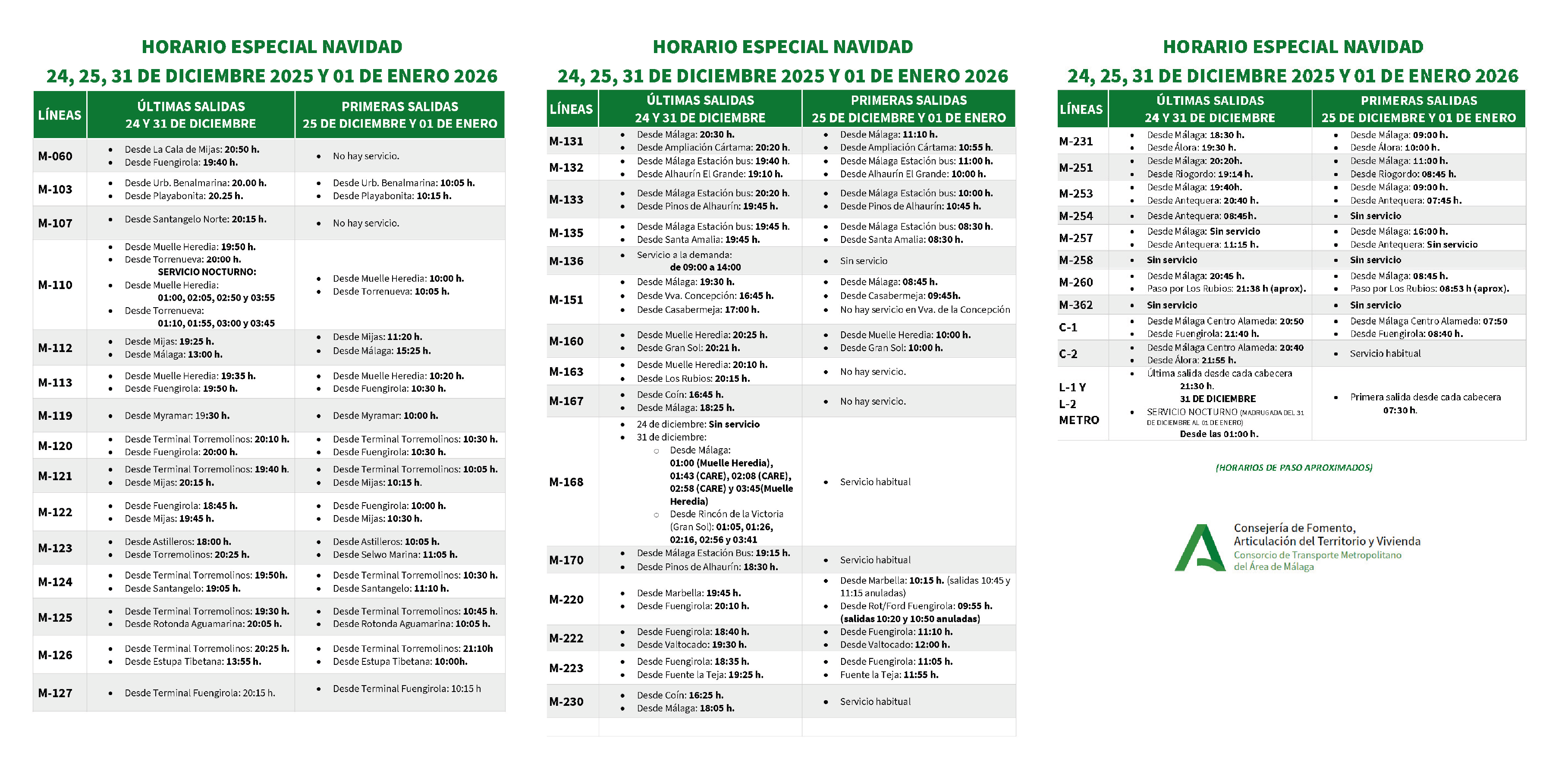 Con motivo de las festividades navideñas, varias líneas de autobús del Consorcio de Transporte Metropolitano del Área de Málaga dispondrán de servicios especiales durante los días más señalados, 24, 25 y 31 de diciembre, y 1 de enero. Puedes consultarlas en el siguiente listado: